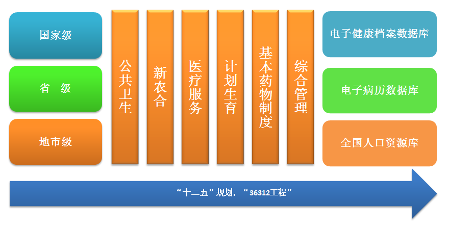 根据国家卫生信息化“十二五”规划“36312工程”要求,“十二五”期间,我国将重点建设国家级、省级和地市级三级卫生信息平台;加强信息化在公共卫生、医疗服务、计划生育、新农合、基本药物制度、综合管理六项业务中的深入应用;建设电子健康档案、电子病历和全国人口数据资源库三个基础数据库;建设一个医疗卫生信息专用网络;逐步建设信息安全体系和信息标准体系。